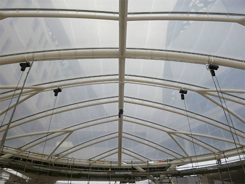 ETFE膜使用壽命至少為25-35年,是用于永久性多層可移動(dòng)屋頂結(jié)構(gòu)的理想材料。該膜材料多用于跨距為4米的兩層或三層充氣支撐結(jié)構(gòu),也可根據(jù)特殊工程的幾何和氣候條件,增大膜跨距。膜長度以易安裝為標(biāo)準(zhǔn),一般為15-30米。小跨度的單層結(jié)構(gòu)也可用較小規(guī)格。